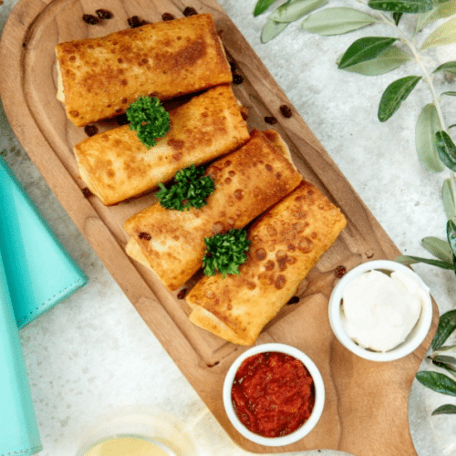 hausgemachte Pfannkuchen gefüllt mit gewürztem Hackfleisch (vom Rind und vom Schwein), gemischt mit gebratenen Zwiebeln und serviert mit Schmand
