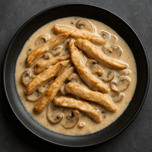 Ragout aus gegrilltem Hähnchen mit Champignons, klassischer Stoganoffsauce, Salat und einer Beilage nach Wahl