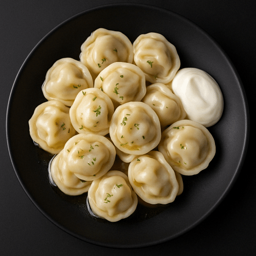 handgemachte, gekochte Teigtaschen gefüllt mit gewürztem Hackfleisch (vom Schwein/Rind oder nur Rind), serviert klassisch mit Schmand und Knoblauchsauce